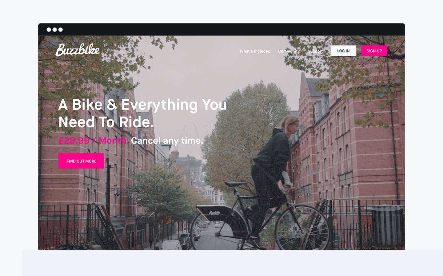 Buzzbike is a premium bike subscription service and urban cycle scheme + technology business, offering a flexible biking scheme to London cyclists with a bike, a secure lock, insurance and servicing an integrated app to track your ride, motivating and incentivising users to ride more, save money and earn rewards .
